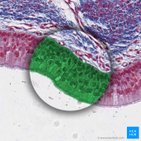 So, epithelial tissue is a tissue made up of cells that cover surfaces both inside and outside of the body, and because of this, it's known as a covering tissue. Epithelial cells rest on a specialized form of extracellular matrix known as the basement membrane or basal lamina. We can see the basement membrane highlighted in green in our image and that it's situated between the epithelial cells whose basal surfaces are attached to it and the underlying connective tissue.