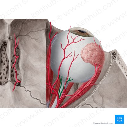 La irrigación del cuerpo ciliar es proporcionada por dos conjuntos de ramas de la arteria oftálmica: las arterias ciliares anteriores y las arterias ciliares posteriores largas.