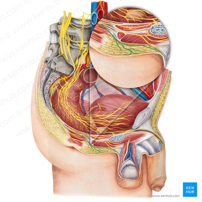 - Ramo genital del nervio genitofemoral: procedente del plexo lumbar, este ramo (L1-2) inerva la superficie anterolateral del escroto.