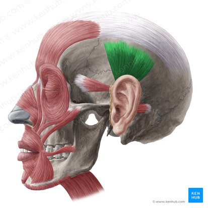 - Auricular anterior, que se origina del borde lateral de la aponeurosis epicraneal y se inserta en la espina del hélix de la oreja.