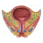 La vejiga urinaria es una víscera hueca con fuertes paredes musculares que se caracteriza por su distensibilidad. Las paredes de la vejiga están compuestas principalmente por el músculo detrusor. En los hombres, hacia el cuello de la vejiga, las fibras del músculo detrusor forman un esfínter involuntario llamado esfínter uretral interno. Este esfínter se contrae durante la eyaculación para prevenir la eyaculación retrógrada (reflujo de eyaculación) del semen hacia la vejiga. Algunas fibras del músculo detrusor discurren radialmente y ayudan a abrir el orificio uretral interno. Los orificios ureterales y el orificio uretral interno están en los ángulos del triángulo de la vejiga.