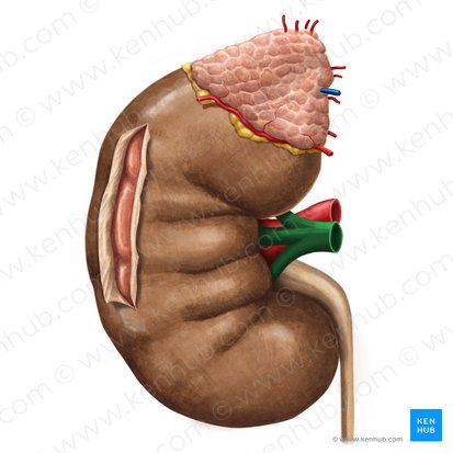Los órganos urinarios superiores (riñones y uréteres) y sus vasos, son estructuras retroperitoneales primarias en la pared abdominal posterior; es decir, originalmente se formaron y siguen siendo vísceras retroperitoneales. La cara superomedial de cada riñón normalmente hace contacto con la glándula suprarrenal, la cual se encuentra rodeada por una cápsula fibrosa y una almohadilla de grasa pararrenal. Esta glándula se conoce como glándula suprarrenal y un tabique facial débil la separa de los riñones para que no estén realmente unidos entre sí. Las glándulas suprarrenales funcionan como parte del sistema endocrino, secretando hormonas como la aldosterona. Se separan completamente en función de los riñones y/o el sistema urinario.