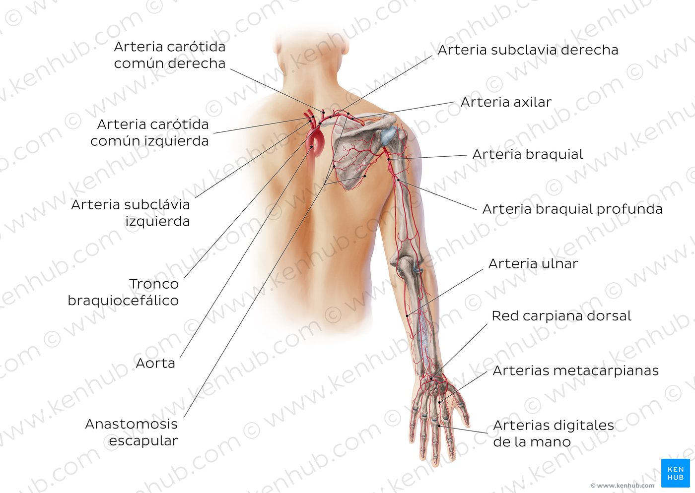 | Arterias principales del miembro superior | Arteria subclavia, arteria axilar, arteria braquial, arteria braquial profunda, arteria radial, arteria ulnar, anastomosis dorsal del carpo, arcos palmares superficial y profundo |