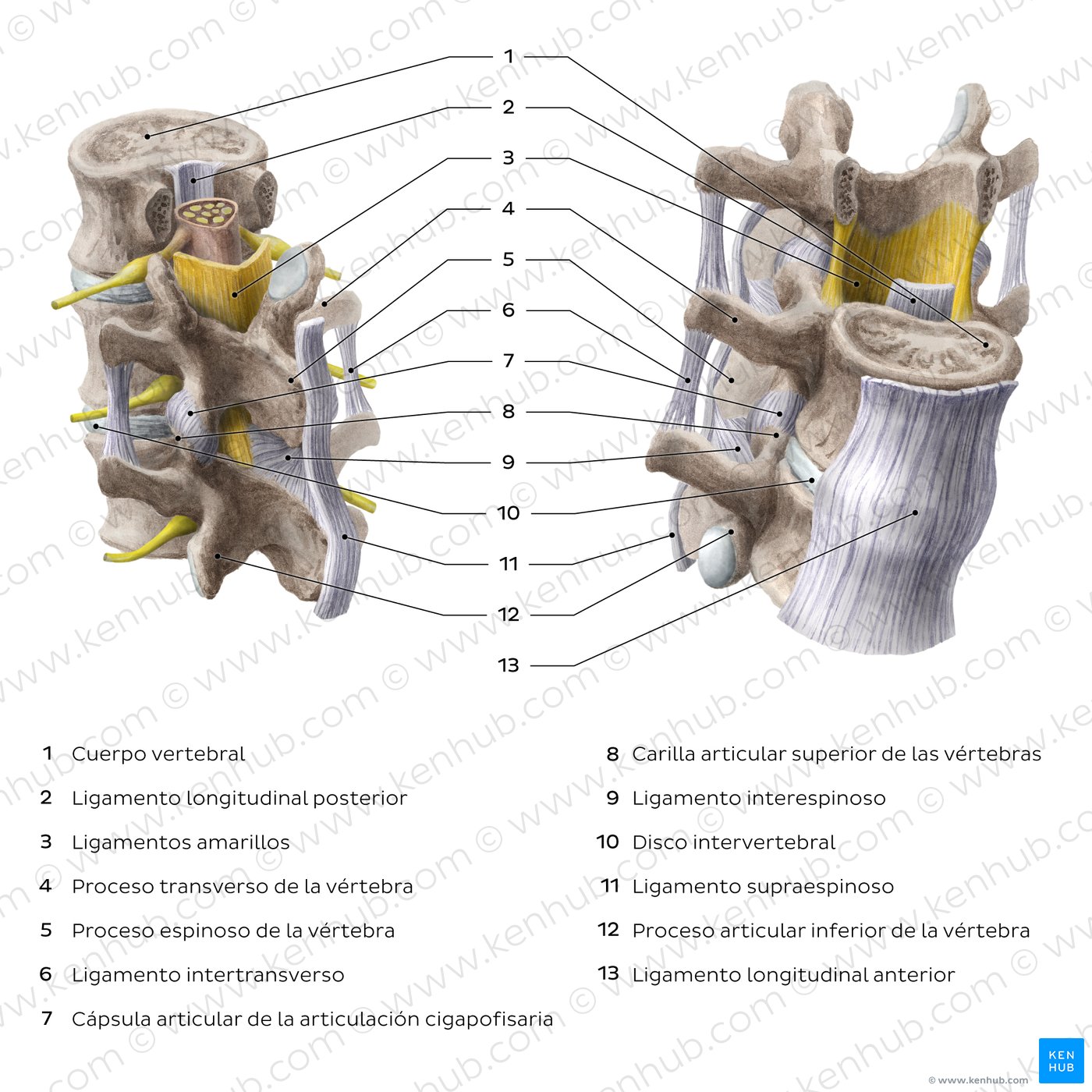 Ligamentos principales Ligamento longitudinal anterior: caras anteriores de los cuerpos vertebrales y de los discos intervertebrales Ligamento longitudinal posterior: caras posteriores de los cuerpos vertebrales y de los discos intervertebrales Ligamentos accesorios Ligamento amarillo: cara posterior del conducto vertebral, a lo largo de las láminas adyacentes Ligamentos interespinosos: procesos espinosos adyacentes Ligamentos supraespinosos: extremos de los procesos espinosos Ligamentos intertransversos: procesos transversos adyacentes Ligamento nucal: protuberancia occipital externa al proceso espinoso de C7 |