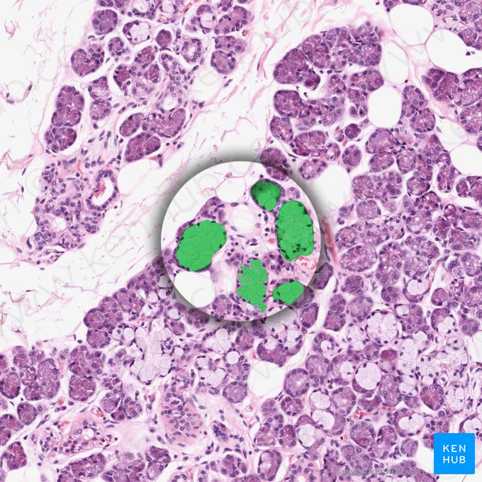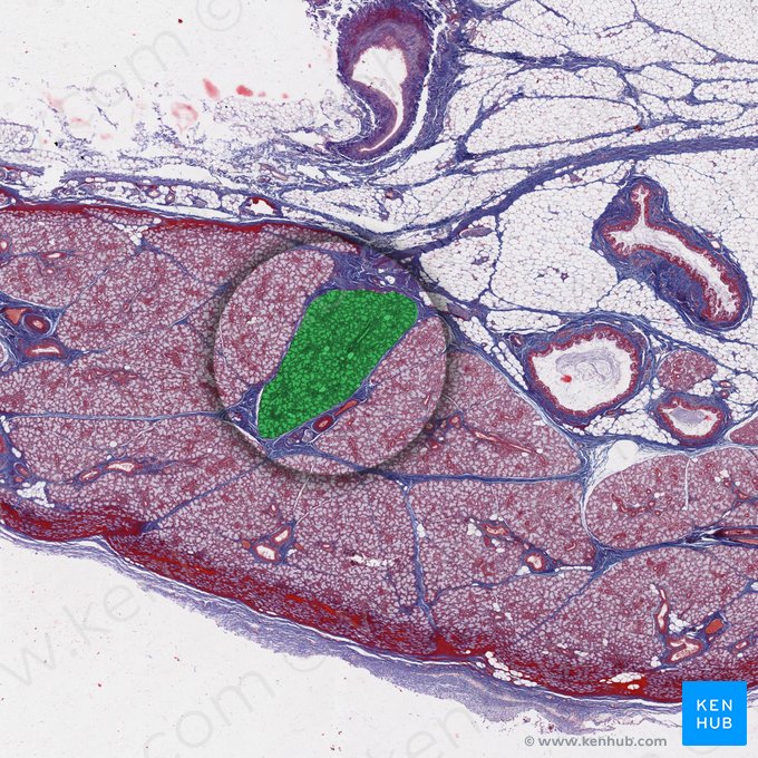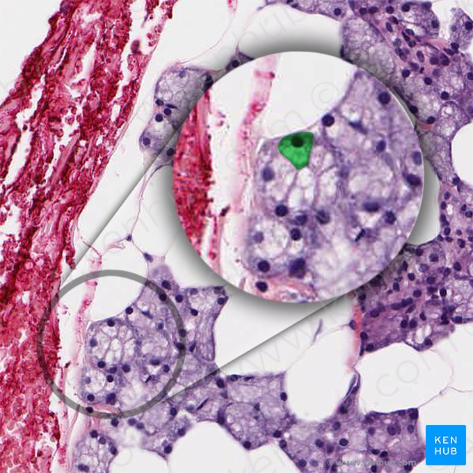 La glándula parótida es puramente serosa con conductos estriados e intercalares distintivos. En el parénquima también pueden encontrarse varias células adiposas, cuya presencia incrementa con la edad. La glándula sublingual es una glándula seromucosa mixta, con una predominancia de células mucosas. Las medialunas serosas (von Ebner) ayudan a eliminar el moco producido. Los conductos estriados e intercalares de la glándula sublingual son muy cortos, por lo que con frecuencia no son visibles en imágenes histológicas. La glándula submandibular es un glándula seromucosa mixta, pero con una proporción más alta de células serosas. Aquí también hay medialunas serosas (von Ebner), las cuales se superponen a los túbulos mucosos.