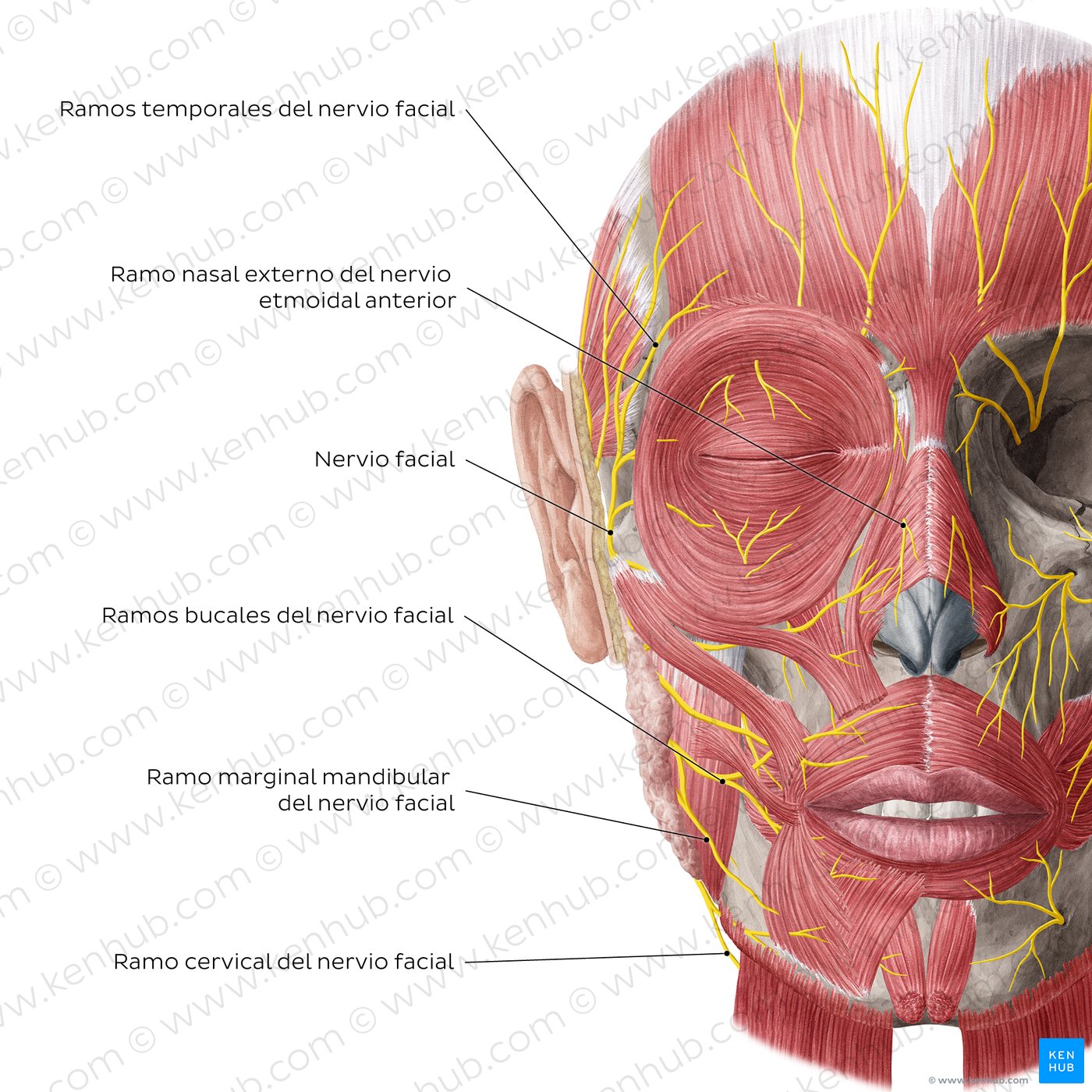 Ramos: nervio auricular posterior, ramos temporales, ramos cigomáticos, ramos bucales, ramo marginal mandibular, ramo cervical Inervación: músculos de la expresión facial |