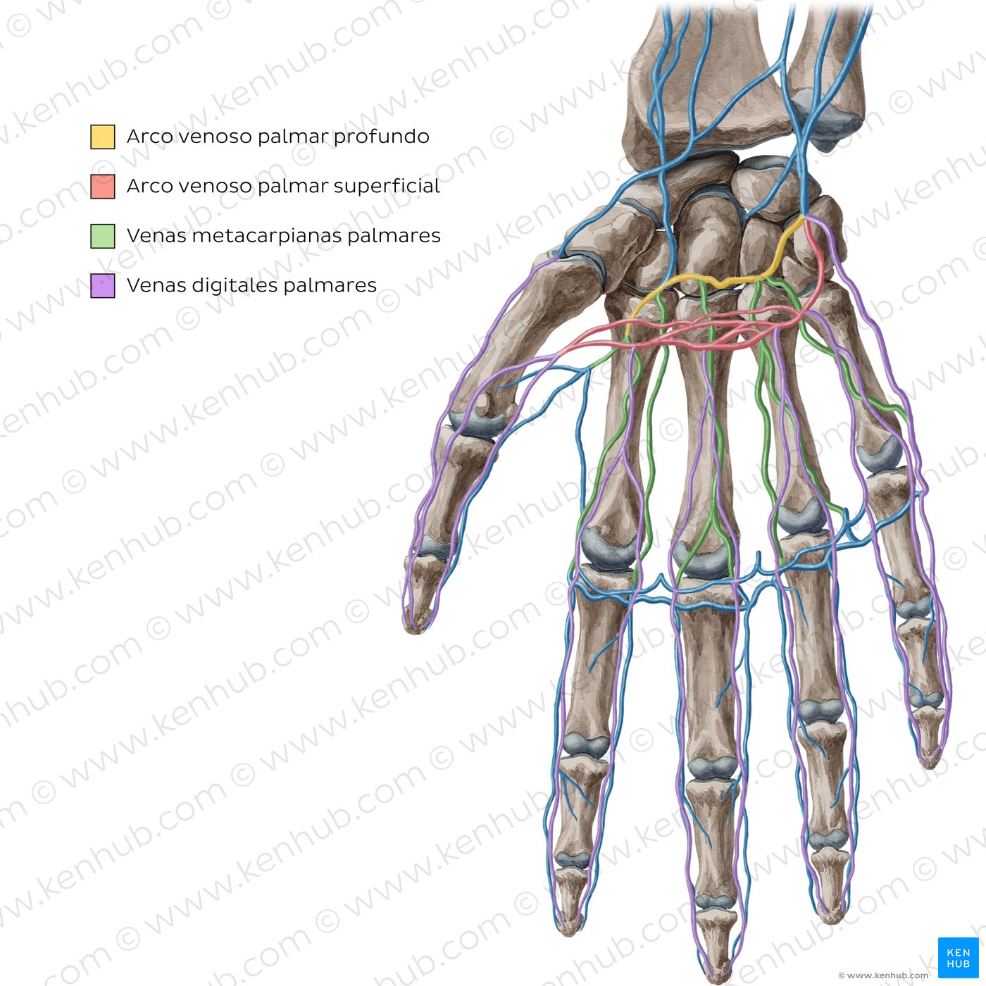 | Venas radiales | Arco venoso palmar profundo, venas metacarpianas palmares |