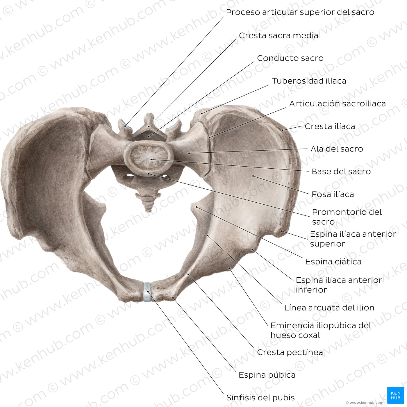 La pelvis ósea es una estructura compleja en forma de cuenca que compone el esqueleto de la región pélvica y contiene los órganos pélvicos. Está formada por el hueso coxal y el sacro, que están unidos por la articulación sacroilíaca