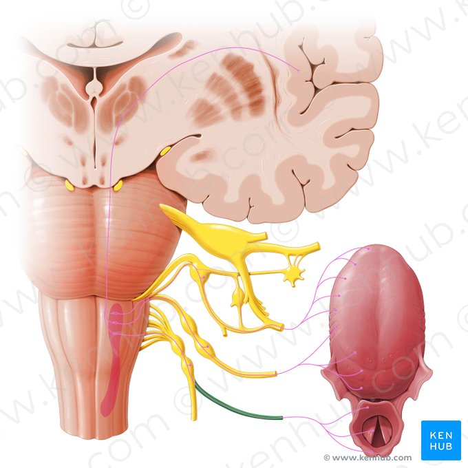 | Nervio facial | 2/3 tercios anteriores de la lengua → cuerda del tímpano paladar blando → nervio petroso mayor → ganglio geniculado → núcleo del tracto solitario |