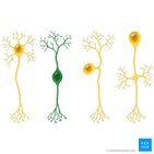 Ahora que hemos visto los componentes de una neurona, vamos a dar un vistazo a los tipos de neuronas y descubriremos las diferentes formas que pueden tener. Las neuronas pueden clasificarse según la cantidad de proyecciones que emergen del cuerpo. Hoy estudiaremos las neuronas multipolares, bipolares, unipolares y pseudounipolares. En esta imagen podemos ver una neurona multipolar destacada en color verde. Cuando decimos polaridad, hablamos del número de proyecciones que emergen del cuerpo de la neurona. Este tipo neuronal tiene un axón único que se extiende desde un extremo del cuerpo y dos o más dendritas que se originan del otro lado. Dada la gran cantidad de prolongaciones que poseen, se denominan multipolares.