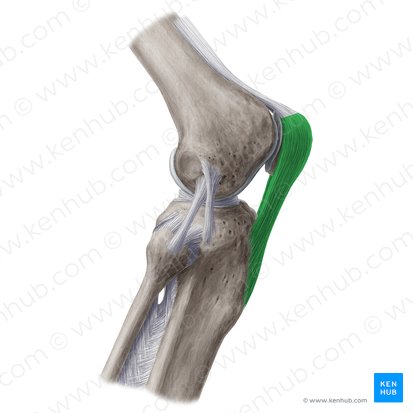 Le ligament de la patella est une bande fibreuse forte et épaisse qui constitue le prolongement distal du tendon du quadriceps fémoral. Elle se trouve à la partie superficielle/antérieure de la bourse infrapatellaire et s'étend de l'apex de la patella à la tubérosité tibiale.