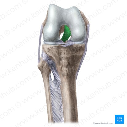 Ligament croisé antérieur : Naît de la zone intercondylaire antérieure du tibia, juste derrière l'attache du ménisque médial, et s'étend de façon postérolatérale et proximale pour se fixer sur la partie postérieure de la face médiale du condyle fémoral latéral. En passant de l'autre côté de l'articulation du genou, le ligament passe sous le ligament transverse (voir ci-dessous) et se confond avec la corne antérieure du ménisque latéral. Le ligament croisé antérieur est important pour empêcher l'enroulement postérieur et le déplacement du condyle fémoral pendant la flexion, et de prévenir l'hyperextension de l'articulation du genou.