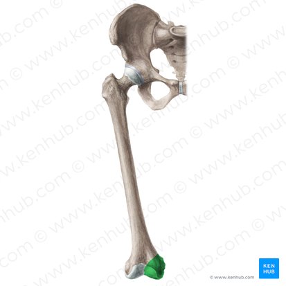 Les condyles latéral et médial sont deux saillies osseuses situées à l'extrémité distale du fémur, qui présentent une surface lisse et convexe et sont séparées en arrière par un profond sillon appelé fosse intercondylienne. Le condyle médial est plus grand, plus étroit et plus avancé que son homologue latéral, ce qui explique l'angle entre le fémur et le tibia. Les surfaces externes rugueuses des condyles médial et latéral sont définies comme les épicondyles médial et latéral, respectivement. Le long de la face postérieure du fémur distal, il existe deux élévations rugueuses au-dessus des épicondyles médial et latéral, appelées crêtes supracondyliennes médiale et latérale.