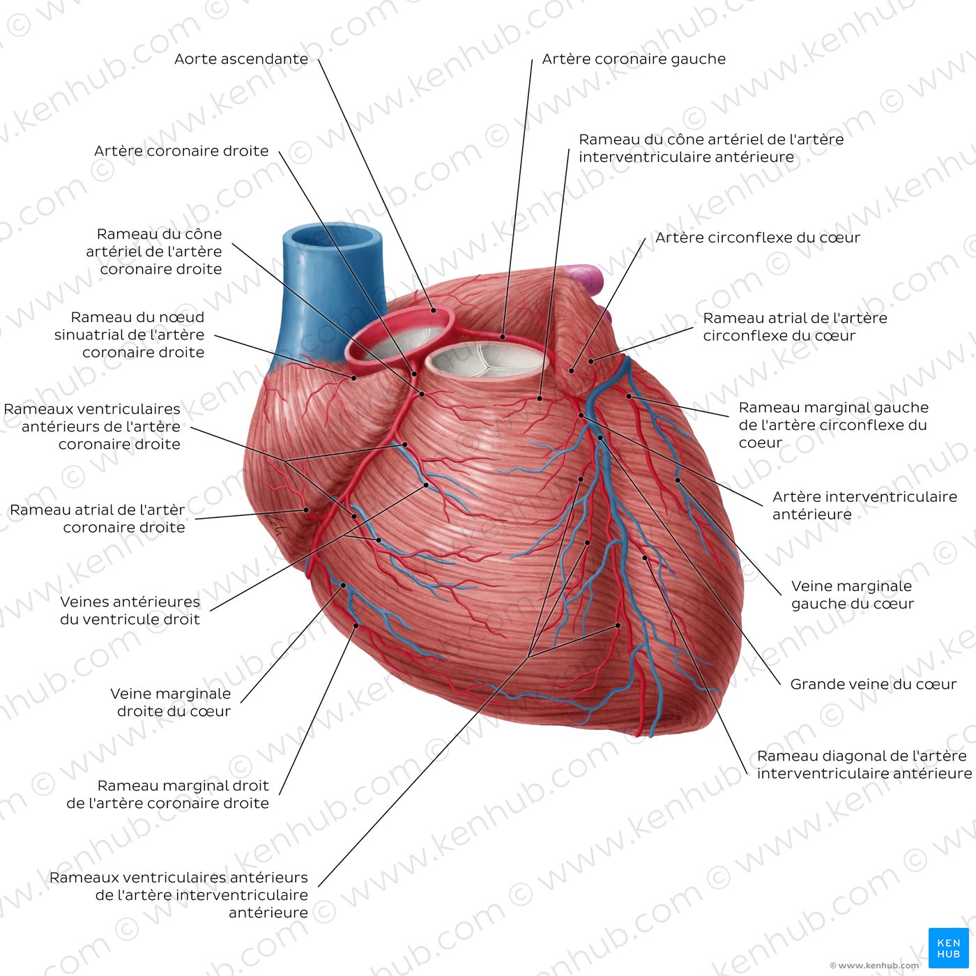 | Circulation du sang dans le coeur | Artère coronaire droite (rameau du noeud sinoatrial, rameau marginal droit, rameau du noeud atrioventriculaire, rameau interventriculaire postérieur) Artère coronaire gauche (artère circonflexe, artère interventriculaire antérieur) Sinus coronaire (veine cardiaque majeure, moyenne, et petite veine cardiaque, veine marginale gauche, veines ventriculaires postérieures gauches) |