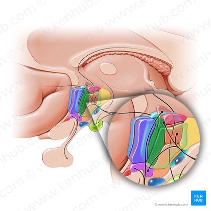| Connexions à l’hypophyse | Voies hypothalamohypophysaires (voies supra-optiques et paraventriculohypophysaires) et voies tubérohypophysaires (tubéro-infundibulaires) |