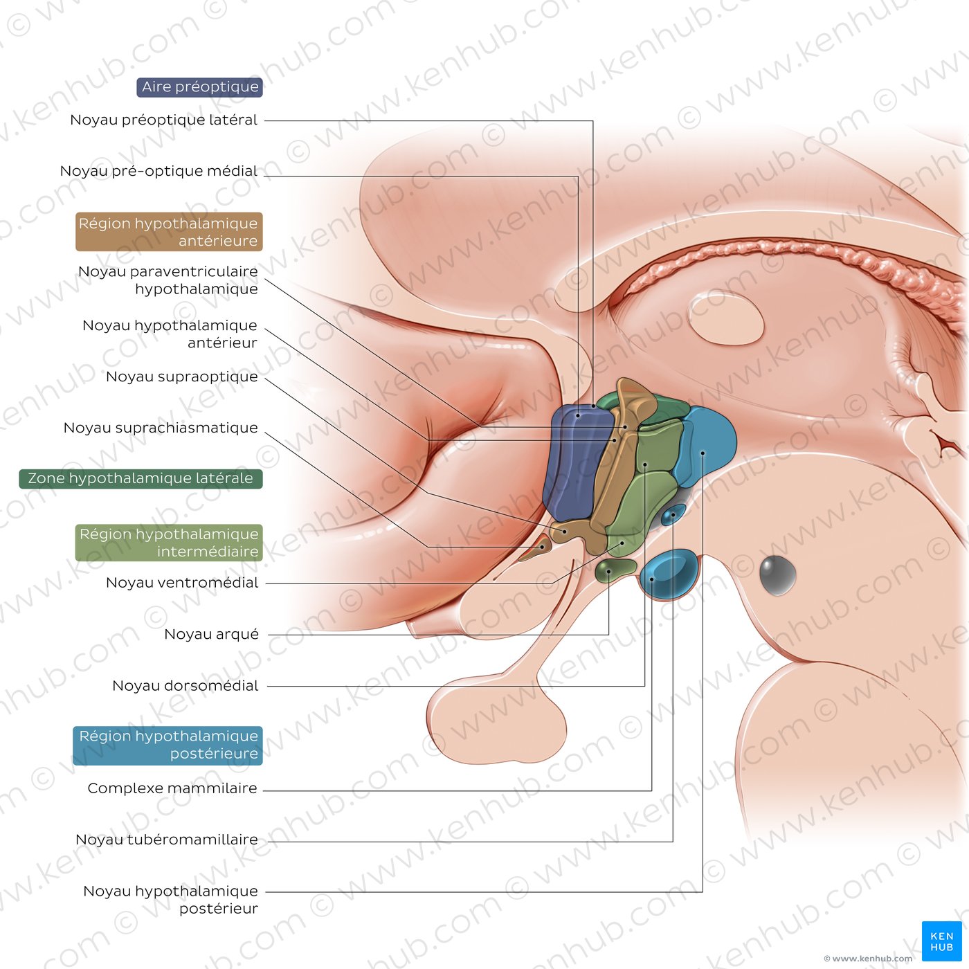 Zones (plan coronal) : Zones périventriculaire, médiale, latérale Zones (plan sagittal) : Régions pré-optique, hypothalamique antérieure (chiasmatique), intermédiaire (tubérale) et hypothalamique postérieure (mamillaire) |