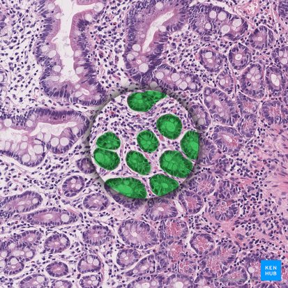 Sur le plan histologique, le jéjunum se différencie du reste de l'intestin grêle par l'absence de glandes de Brunner (duodénum) et de plaque de Peyer (iléon), mais des follicules lymphoïdes isolés sont présents.