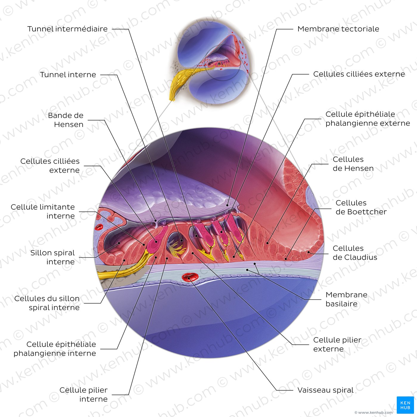 L'organe de l'audition (organe spiral) est présenté dans le canal cochléaire. Il s'agit d'un canal membraneux de forme triangulaire qui s'enroule deux fois et demie autour du Modiolus, en suivant la courbure du canal spiral de la cochlée et de la lame spirale osseuse.