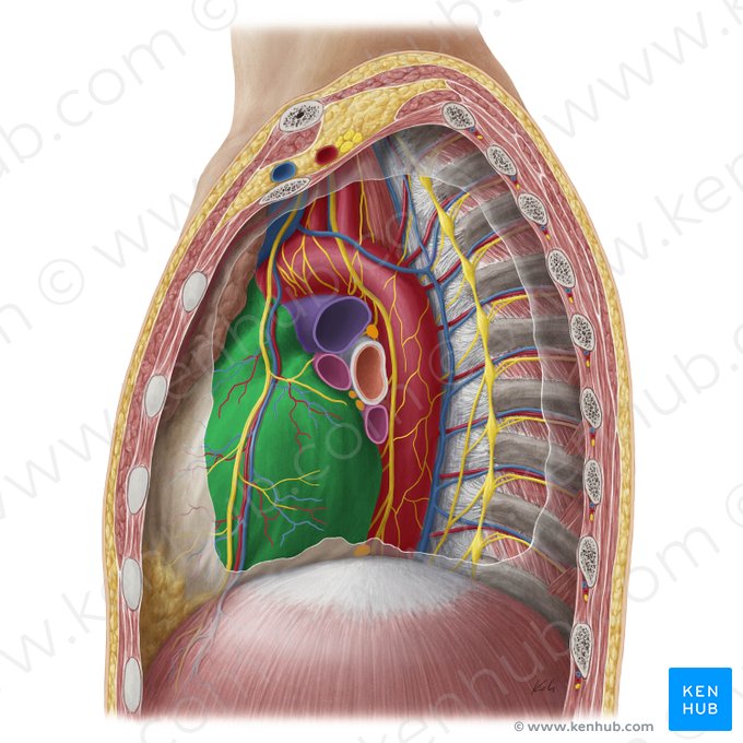 - En arrière, entourant les veines (veine cave supérieure, veine cave inférieure, veines pulmonaires)