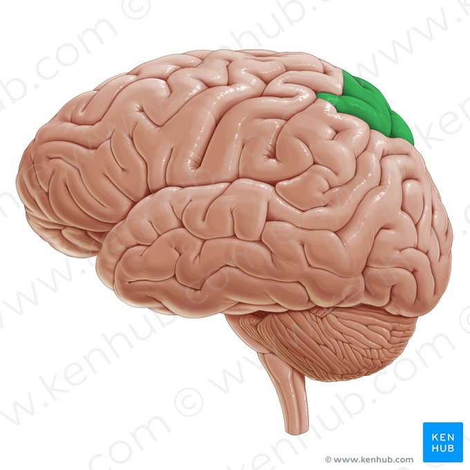 | Lobe frontal | Antérieur au sillon central, supérieur au sillon latéral Gyri principaux : Gyrus précentral, frontal supérieur, frontal moyen, frontal inférieur Contrôle des mouvements volontaires, impliqué dans l'attention, les tâches impliquant la mémoire à court terme, la motivation, la planification et la parole |