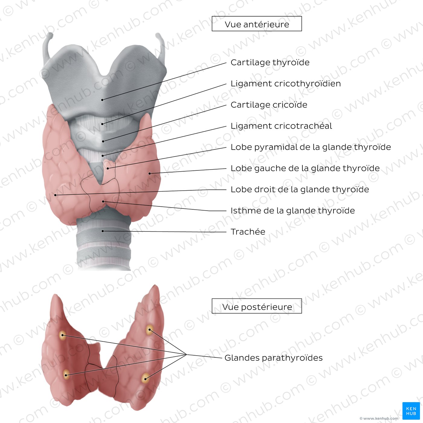 Glande thyroïde : Lobes gauche et droit, isthme, lobe pyramidal (variable) Glande parathyroïde : Quatre glandes en forme de lentille situées à l'arrière de chaque lobe de la glande thyroïde |