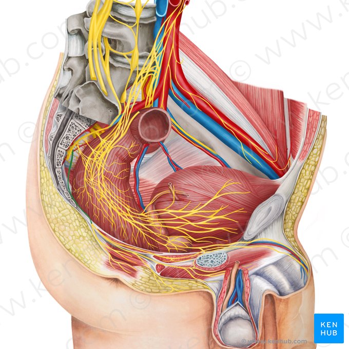 Plexus : Plexus hypogastrique supérieur, plexus hypogastrique inférieur, plexus rectal, plexus vésical, plexus déférentiel, plexus prostatique Nerfs : Nerfs splanchniques lombaires, nerfs splanchniques sacrés, nerfs hypogastriques, nerfs splanchniques pelviens Fonction : Innervation sympathique et parasympathique du rectum, de la vessie, de l'urètre, des testicules, de l'épididyme, du canal déférent, de la prostate, des glandes séminales et bulbo-urétrales, des corps caverneux du pénis |