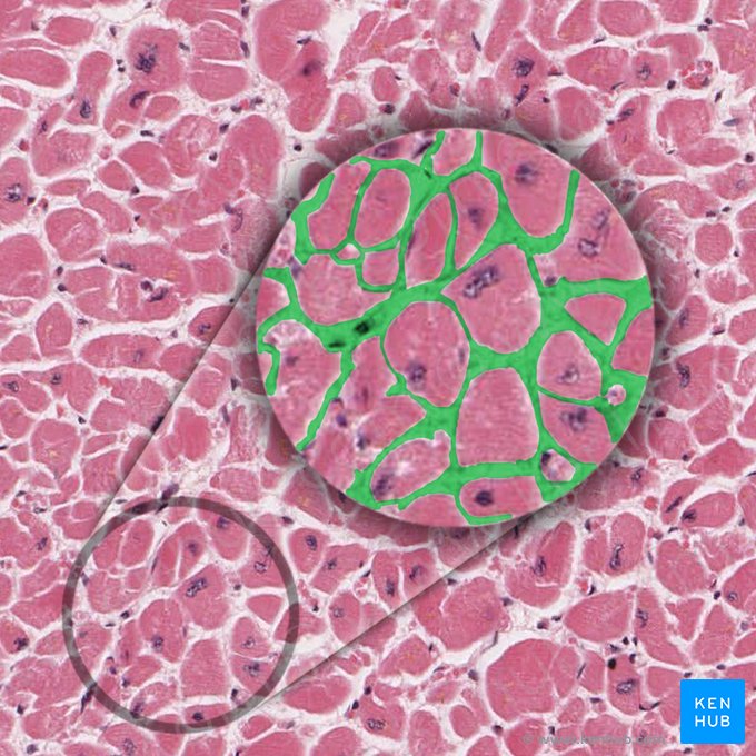 Le tissu musculaire cardiaque (myocarde) est constitué de cellules musculaires cardiaques individuelles, ramifiées, dont la plupart sont mononucléées et appelées cardiomyocytes. Celles-ci sont reliées entre elles par des points d'ancrage adhésifs et des jonctions communicantes (gap), formant ainsi un syncytium fonctionnel. Semblable au muscle squelettique, le muscle cardiaque présente des stries au microscope, mais sa structure globale est plus réticulée et ramifiée. De plus, le myocarde contient également du tissu conjonctif, des vaisseaux sanguins et des fibres nerveuses.