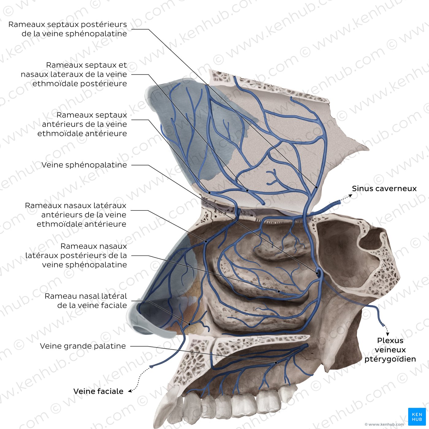 | Veines nasales | Veines nasales supérieures — se drainent dans le sinus caverneux Veines nasales centrales et postérieures — se drainent dans le plexus veineux ptérygoïdien Veines nasales antérieures — se drainent dans la veine faciale |