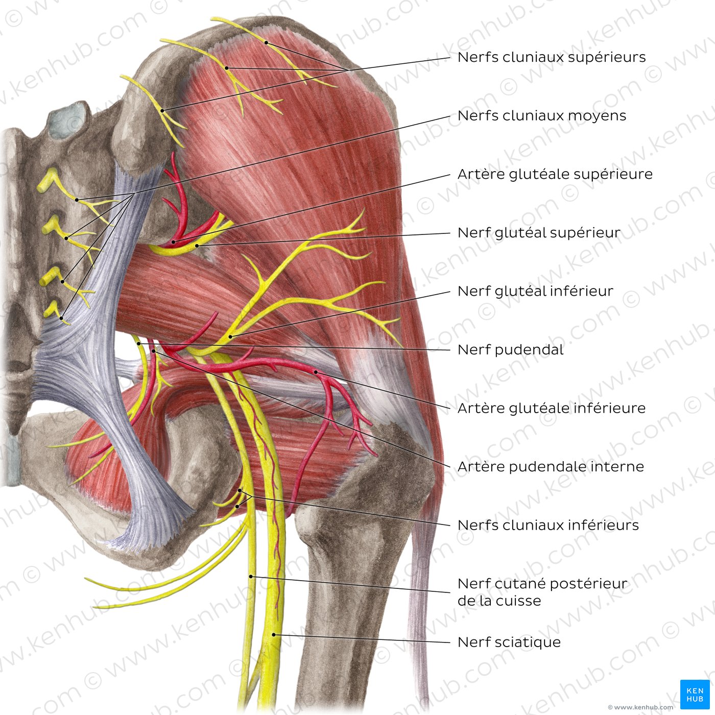 Nerf fémoral : Quadriceps fémoral, pectiné, sartorius Nerf sciatique : Biceps fémoral, semimembraneux, semitendineux et la partie ischiatique du grand adducteur Nerf obturateur : Court adducteur, long adducteur, gracile, obturateur externe, grand adducteur Nerf glutéal supérieur : Tenseur du fascia lata, petit glutéal, moyen glutéal, piriforme Nerf glutéal inférieur : Grand glutéal |