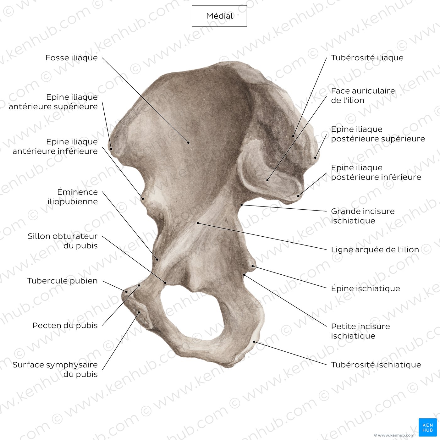 Explorez les os et les repères osseux de l'os coxal d'un point de vue médial et latéral dans les galeries ci-dessous.