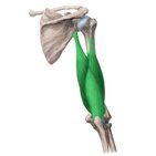 En retirant le biceps brachial, nous pouvons voir ce muscle mis en évidence en vert : c’est le muscle coracobrachial. Le coracobrachial prend son origine sur le processus coracoïde de la scapula et s'étend distalement pour s'insérer le long de la face antéromédiale de l'humérus. Ce muscle assiste la flexion et l'adduction du bras au niveau de l'articulation de l'épaule, et aide également pour la rotation interne du bras au niveau de l'articulation de l'épaule.