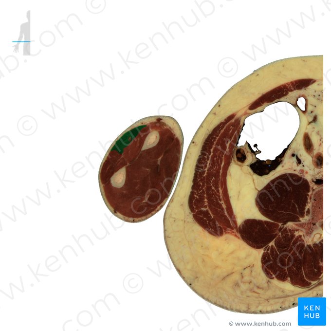 O compartimento posterior do antebraço está localizado posterior ao rádio, ulna e membrana interóssea. Neste corte transversal, eles estão voltados para a região anterior. Os músculos profundos visíveis (abdutor longo do polegar e extensor longo do polegar) estão perto dos ossos do antebraço. Eles são encobertos pelos músculos superficiais (extensor do polegar, extensor do dedo mínimo e extensor ulnar do carpo). O visível grupo radial de músculos (braquiorradial e extensor radial do carpo) é fácil de identificar, pois ele circunda o rádio.