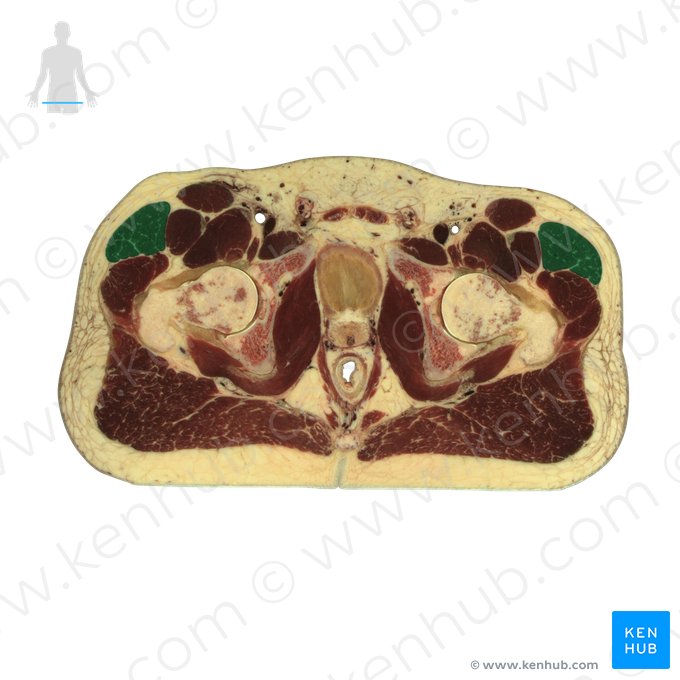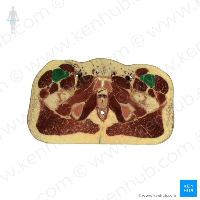 Os principais músculos da pelve estão localizados na região glútea posterior. O gêmeo inferior (lateral) e o obturador interno (medial) estão localizados profundamente, em grande proximidade e posterior ao fêmur e ao acetábulo. O glúteo máximo, grande e superficial, cobre esses dois músculos. O nervo ciático pode ser encontrado entre as duas camadas musculares. Os músculos do compartimento anterior da coxa estão localizados anterior ao fêmur. Você já viu alguns deles quando discutimos o corte transversal da coxa. Entretanto, alguns outros estão presentes aqui, de medial para lateral: pectíneo, iliopsoas, reto femoral e tensor da fáscia lata. O sartório é o mais superficial deles, localizado anterior aos outros três. A artéria, veia e nervo femoral estão localizados no trígono femoral formado pelo sartório (lateral), pectíneo e iliopsoas. A veia é fácil de encontrar, pois ela tem o maior diâmetro dentre os três. Medial ao trígono femoral, na linha média, você pode ver o cordão espermático e o músculo reto abdominal.