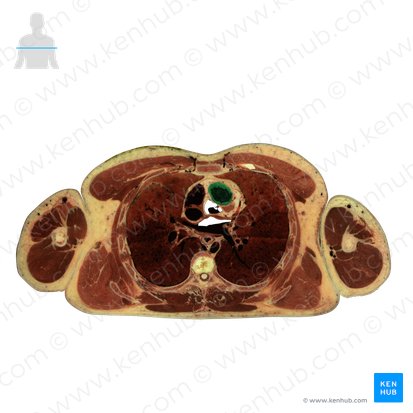 Paradoxalmente falando, orientar-se é muito mais fácil neste corte em comparação com os membros, apesar do aumento da complexidade do tórax. A forma típica da terceira vértebra torácica se encontra posteriormente (parte inferior da imagem) enquanto os pulmões estão apontando lateralmente. O esôfago pode ajudá-lo a distinguir a esquerda da direita, porque normalmente fica ligeiramente à esquerda da vértebra.