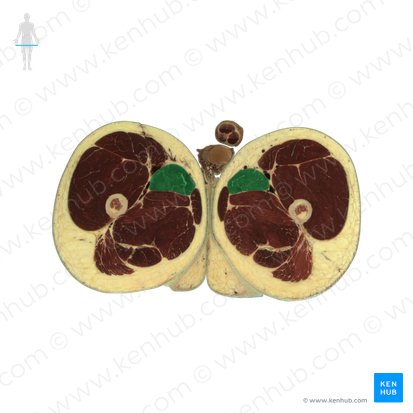 Como sempre, a análise da secção transversal começa pela nossa orientação. A porção anterior (topo da imagem) é marcada pelo forte e bem desenvolvido músculo quadríceps, que aparece como quatro bandas evidentes, especialmente em atletas. Os lados medial e lateral seguem a orientação padrão da anatomia transversal.