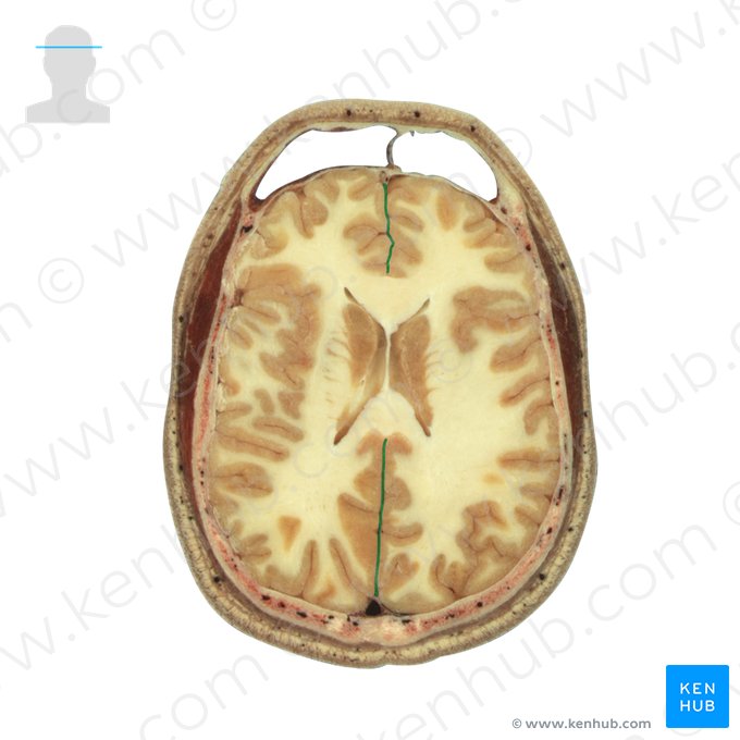 Se você imaginar a secção transversa como uma cebola, três “camadas” principais podem ser observadas, de externo para interno: tecidos moles externos, neurocrânio e cérebro. A aponeurose epicraniana fibrosa se estende anteroposteriormente sobre a parte superior do crânio como um cobertor. Dois músculos mastigatórios laterais (músculos temporais) são encontrados de cada lado do crânio, sobre os ossos temporais.
