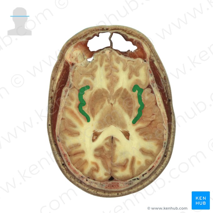 Nós vamos começar com uma secção transversa da cabeça, na qual diferentes estruturas do cérebro são visíveis. O cérebro é parte do sistema nervoso central e é responsável por várias funções, que vão desde a simples homeostase até funções cognitivas superiores como o pensamento crítico, memória etc. No vídeo a seguir você verá o cérebro de uma vista lateral, que pode te ajudar a se familiarizar com essa anatomia clássica: