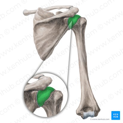 A fossa glenoide é uma fossa com formato de uma pêra no ângulo superolateral da escápula. A superfície articular com a cabeça do úmero não é completamente congruente, já que a concavidade da glenoide não é suficiente para abrigar a convexidade da cabeça umeral. A congruência é um pouco aumentada pela presença do labrum glenoidal, um anel fibrocartilaginoso que se insere nas margens da fossa. O labrum atua aumentando discretamente a profundidade da fossa glenoide. Possui formato triangular e é mais espesso anteriormente do que inferiormente. A superfície da cabeça do úmero é três a quatro vezes maior que a superfície da fossa glenoide, ou seja, somente um terço da cabeça umeral está em contato com a fossa e o labrum a cada momento.