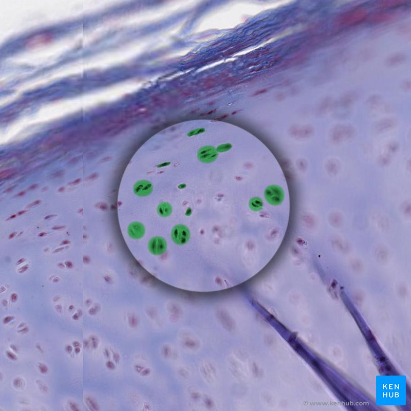 - Cartilagem hialina: tipo mais comum de cartilagem no corpo humano. Sua matriz é formada por fibrilas de colágeno tipo II. Encontrada nas vias aéreas, nas fossas nasais, nas cartilagens costais e na superfície articular dos ossos longos (cartilagem articular). É ainda responsável pelo processo de ossificação endocondral e crescimento ósseo nos discos epifisários.
