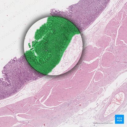 A camada muscular da mucosa consiste em duas camadas finas de músculo liso. Ela separa a lâmina própria da submucosa subjacente. A camada interna da muscular mucosa consiste de fibras circulares, enquanto as fibras da camada externa se encontram dispostas longitudinalmente. A sua função é ajudar a expulsar as secreções das glândulas gástricas para o lúmen do estômago. Aprenda mais sobre o trato gastrointestinal superior com nossos materiais de estudo.