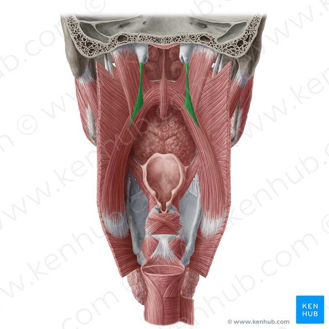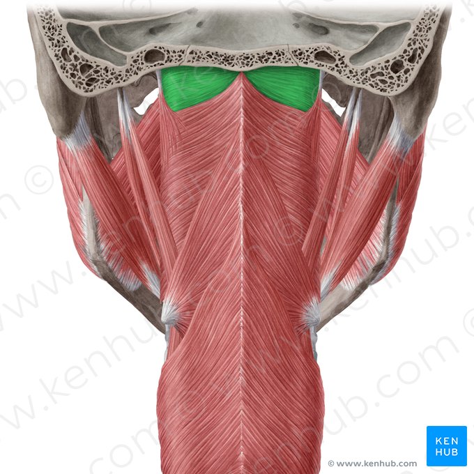 Ele se insere no tubérculo faríngeo e na rafe faríngea. Sua função é a de constricção da parte superior da faringe.