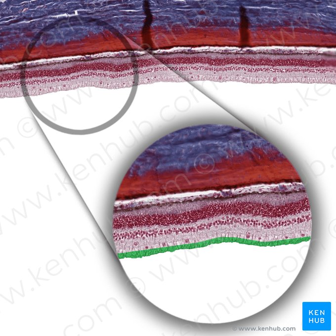 O placódio óptico, localizado na extremidade craniana do embrião em desenvolvimento, forma o olho e as estruturas envolventes. A evaginação de um segmento do prosencéfalo dá origem à retina do olho. A porção externa a tacícula óptica é rica em pequenos grânulos de pigmento, e torna-se na camada pigmentar da retina.