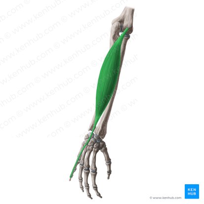 O extensor radial longo do carpo é um músculo longo localizado no aspecto lateral (radial) do antebraço. Ele se origina da crista supracondilar lateral do úmero e do septo intermuscular lateral do braço. O músculo então cursa distalmente, terminando em um tendão que se insere na base do osso metacarpal do segundo dedo.