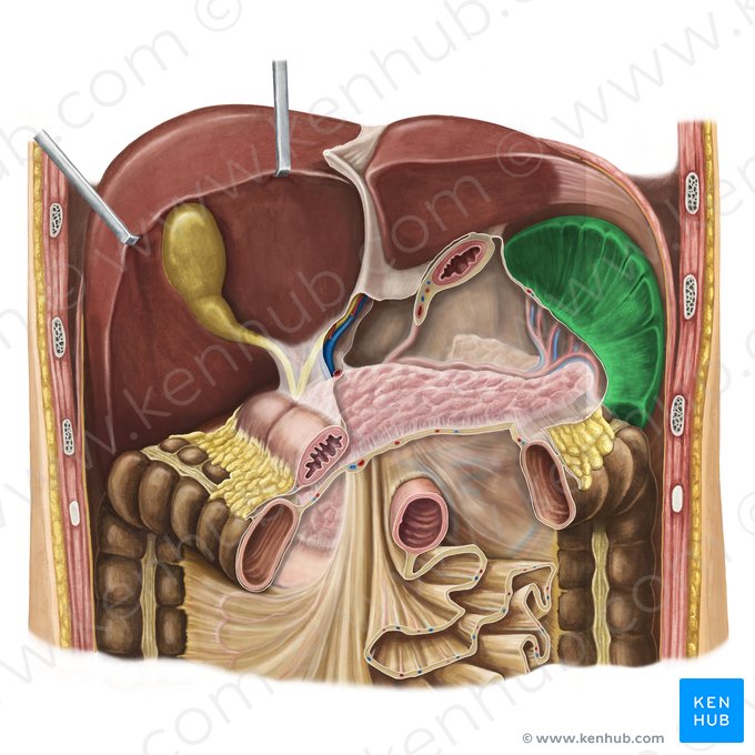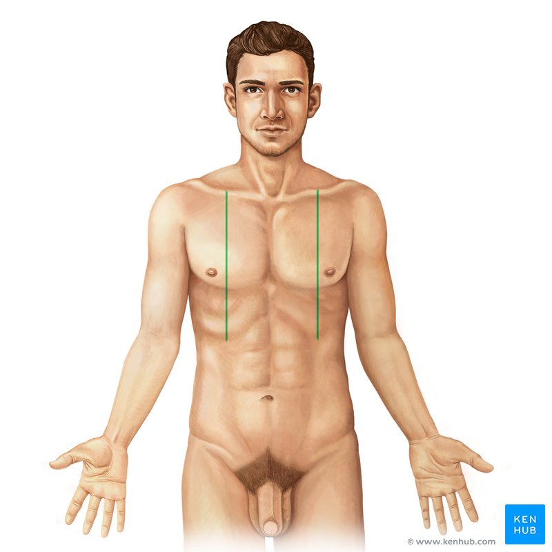 Comparado ao esquema de quatro regiões, essa divisão do abdome pode parecer mais complicada. Entretanto, ela pode auxiliar na melhor localização dos sintomas clínicos e chegar a um diagnóstico preciso mais rapidamente. Existem dois planos verticais e dois planos horizontais que são utilizados para separar os nove segmentos. Os planos verticais são conhecidos como as linhas hemiclaviculares direita e esquerda, e cursam do ponto médio da clavícula caudalmente até o ponto médio do ligamento inguinal, de cada lado.