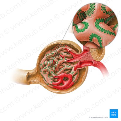 Conforme mencionado previamente, o corpúsculo renal consiste de glomérulos e da cápsula de Bowman. O glomérulo é um leito capilar de anastomoses formado por arteríolas aferentes e artérias interlobulares. As paredes capilares são fenestradas e cercadas por uma membrana de filtração de duas camadas. A membrana de filtração visceral possui um endotélio único que é formado por podócitos que se entrelaçam entre si, formando uma camada de filtração seletiva por tamanho.
