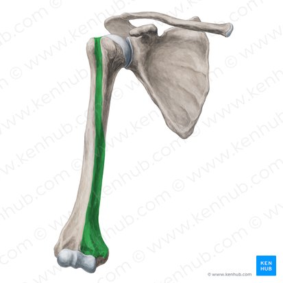 A borda lateral começa logo distal ao tubérculo maior do úmero. Ele se torna mais espesso distalmente para formar a crista supracondilar lateral. A porção média da borda lateral é adjacente à área rugosa em forma de V conhecida como tubérculo / tuberosidade deltóidea.