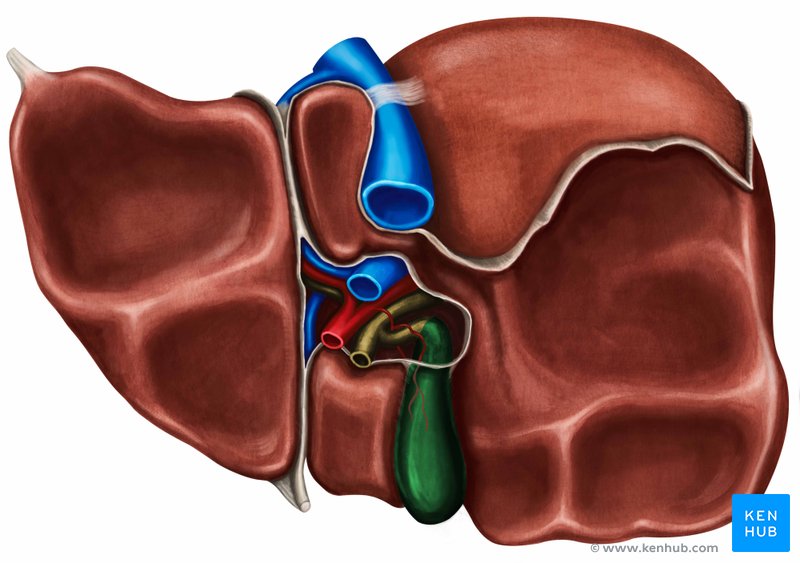 Ducto cístico, segmento hepático V e ducto hepático comum. Contém tecido adiposo, nódulos linfáticos e vasos e outras estruturas neurovasculares. |