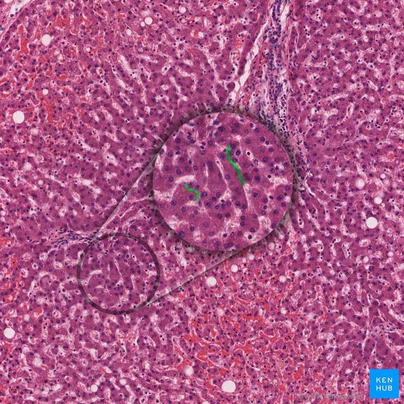 O trato biliar intrahepático é um sistema único projetado para transportar a bile dos hepatócitos para a árvore biliar extrahepática. Começa no nível do canalículo biliar (canal canalículo), que é um espaço dilatado entre os hepatócitos adjacentes. Lembre-se de que os hepatócitos poliédricos são dispostos de tal modo que suas extremidades apicais projetam-se nos sinusóides hepáticos (que eventualmente coalescem nas veias hepáticas). As bases dessas células estão voltadas para os canalículos biliares e secretam bile para esses canais. Acredita-se que as paredes dos canalículos sejam regiões modificadas das paredes dos hepatócitos contribuintes. À medida que esses canais se formam, eles seguem um caminho semelhante aos sinusóides hepáticos. No entanto, seu conteúdo flui na direção oposta.