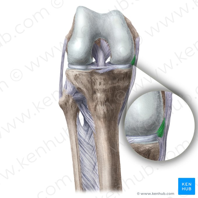 Ligamentos extracapsulares: ligamento patelar (rotuliano), retináculo patelar medial e lateral, ligamento colateral tibial (medial), ligamento meniscofemoral medial, ligamento meniscotibial medial, ligamento colateral fibular (lateral), ligamento poplíteo oblíquo, ligamento poplíteo arqueado, ligamento ântero-lateral Ligamentos/meniscos intracapsulares: ligamento cruzado anterior (LCA), ligamento cruzado posterior (LCP), menisco medial, menisco lateral, ligamento transverso do joelho, ligamento meniscotibial anterior, ligamento meniscofemoral posterior |