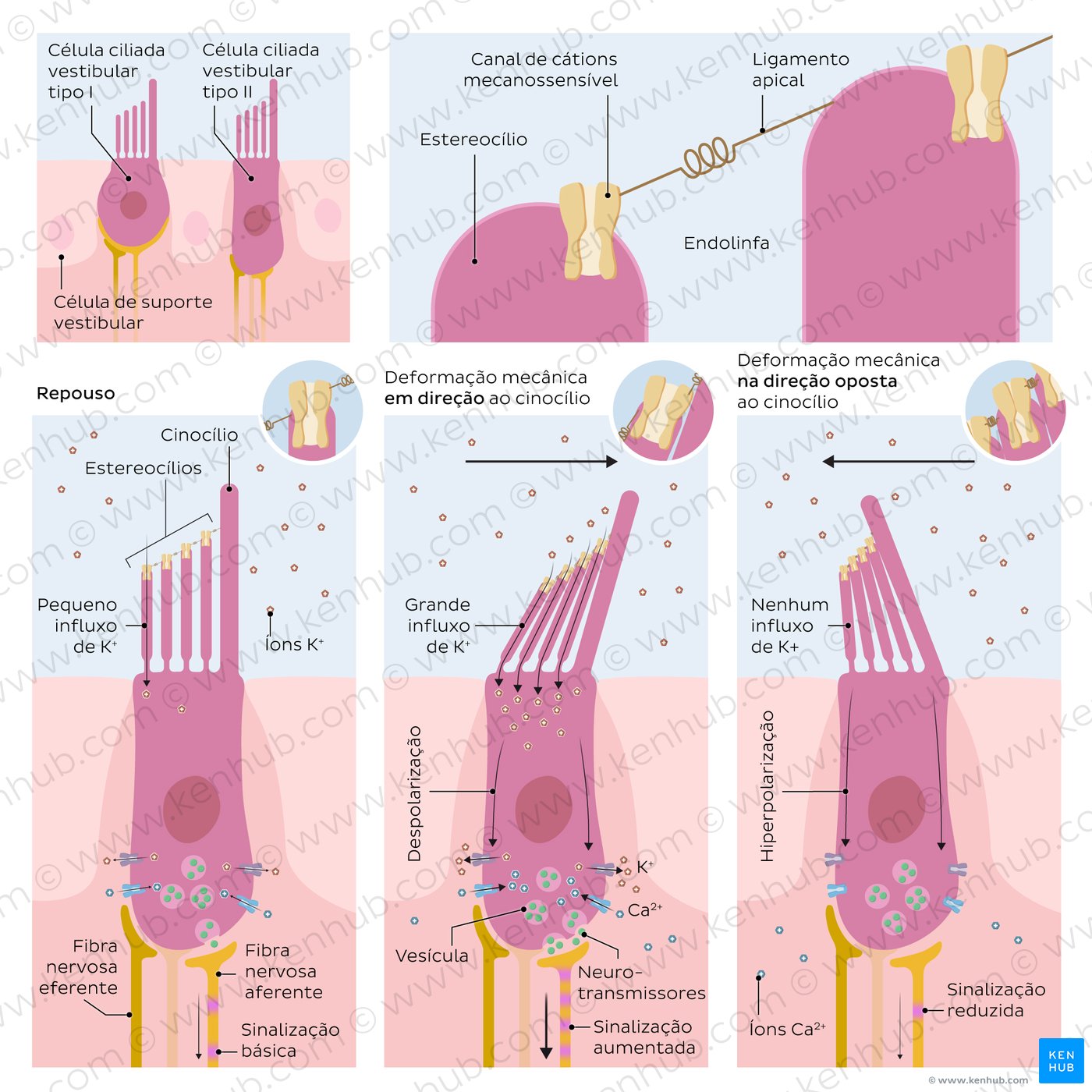 Definição: Processo através do qual as células ciliadas vestibulares convertem estímulos mecânicos em sinais elétricos Mecanismo: Despolarização Deflexão dos estereocílios em direção ao cinocílio > abertura dos canais de cátions > grande influxo de K+ > ativação de canais de Ca2+ dependentes de voltagem > Influxo de Ca2+ > aumento da liberação de glutamato e sinalização para o encéfalo Hiperpolarização: Deflexão dos estereocílios na direção oposta à do cinocílio > fechamento dos canais de cátions > redução do influxo de K+ > desativação dos canais de Ca2+ dependentes de voltagem > redução do influxo de Ca2+ > redução da liberação de glutamato e da sinalização para o encéfalo |